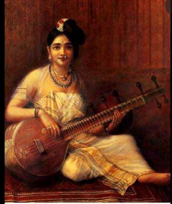 (It makes me think of Saraswati, the Hindu goddess of music, art and creativity floating gently above my head. Strumming her veena to the rhythm of my writing.)